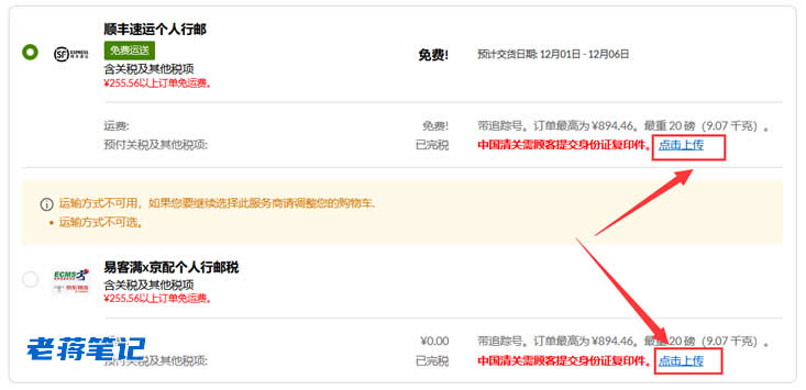 我们输入邮编,然后确定后可以看到运输方式。我们看到可选运输方式后再选择。比如老蒋常用的运输方式是顺丰个人行邮模式。无需关税直接涵盖在商品中。
