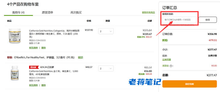 我们可以看到订单购物车。右上角有输入iHerb折扣码的,我们可以根据需要和当前活动输入。如果没有折扣码输入就正常以直接优惠为准。