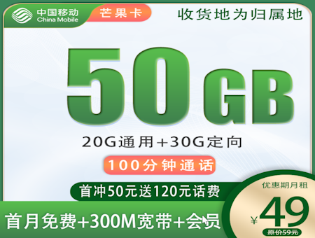 资费详情:芒果卡59元档,月租59元,包含20G通用流量+30G定向流量+100分钟通话+300M宽带+咪咕会员+芒果TV会员。