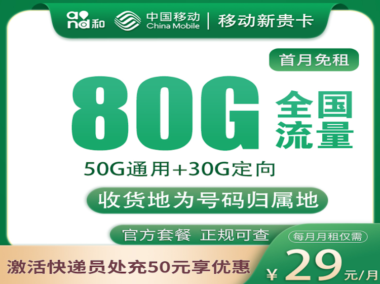 首月免租 含50G全国流量+100分钟通话+300M宽带+1年视频会员