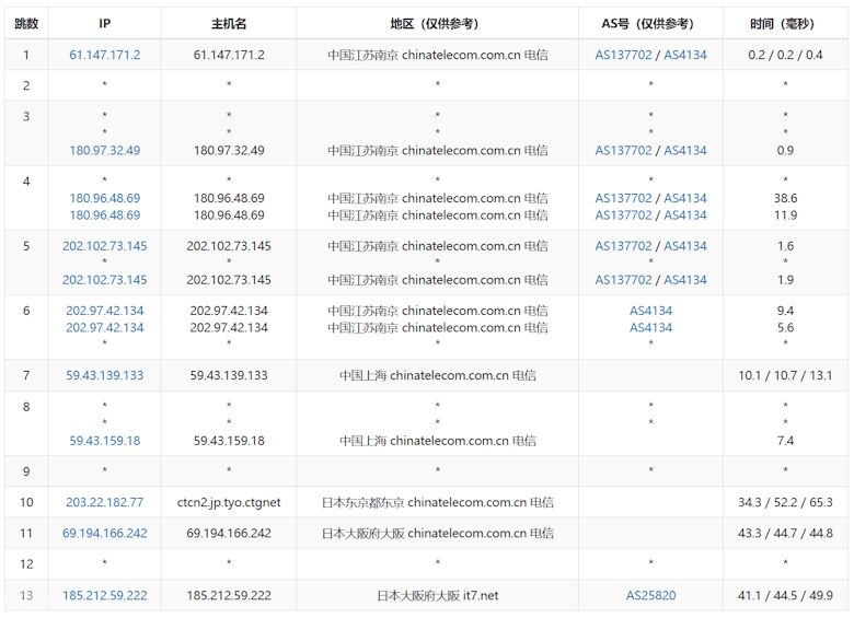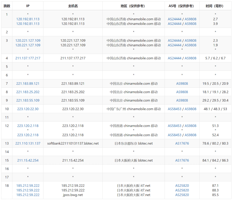 移动走的是香港节点出去的到日本。