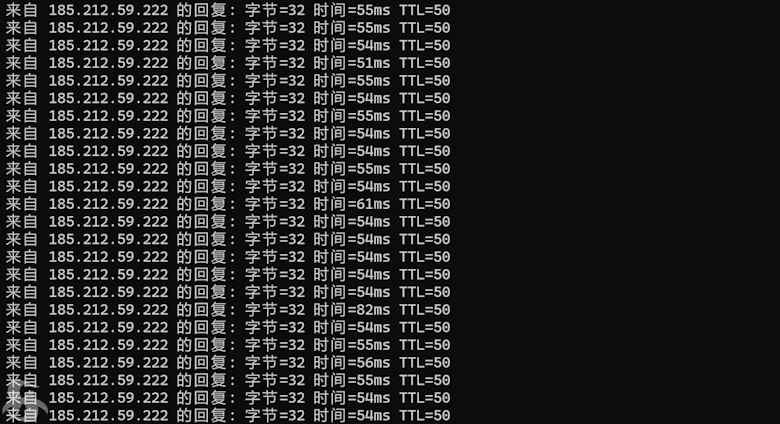 我们这里先在本地的PING测速看看,可以看到晚高峰也能到50ms左右,说明性能还是很好的,只是稍微有点点丢包。
