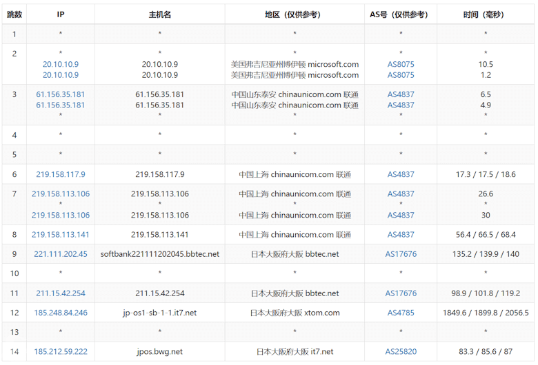 联通节点走的是上海出口到日本节点。