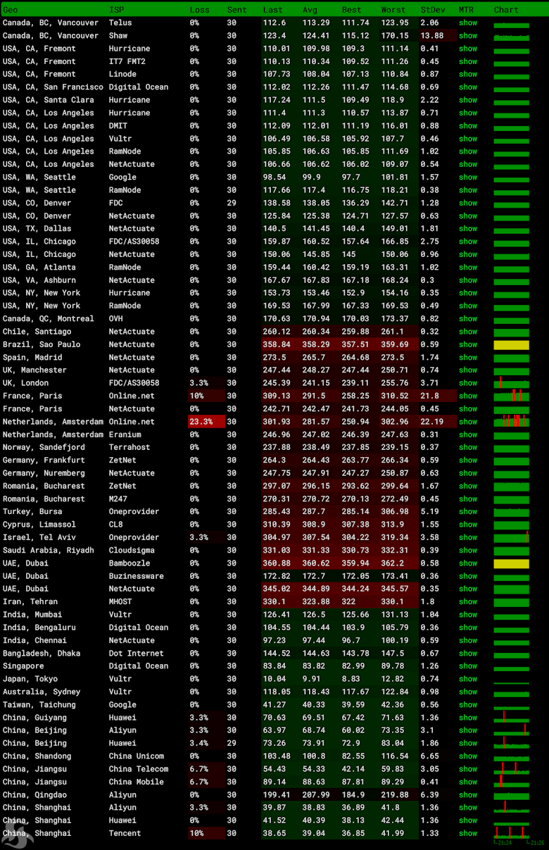 对于亚洲和中国大陆地区的延迟可以看到稳定性还是比较高的。