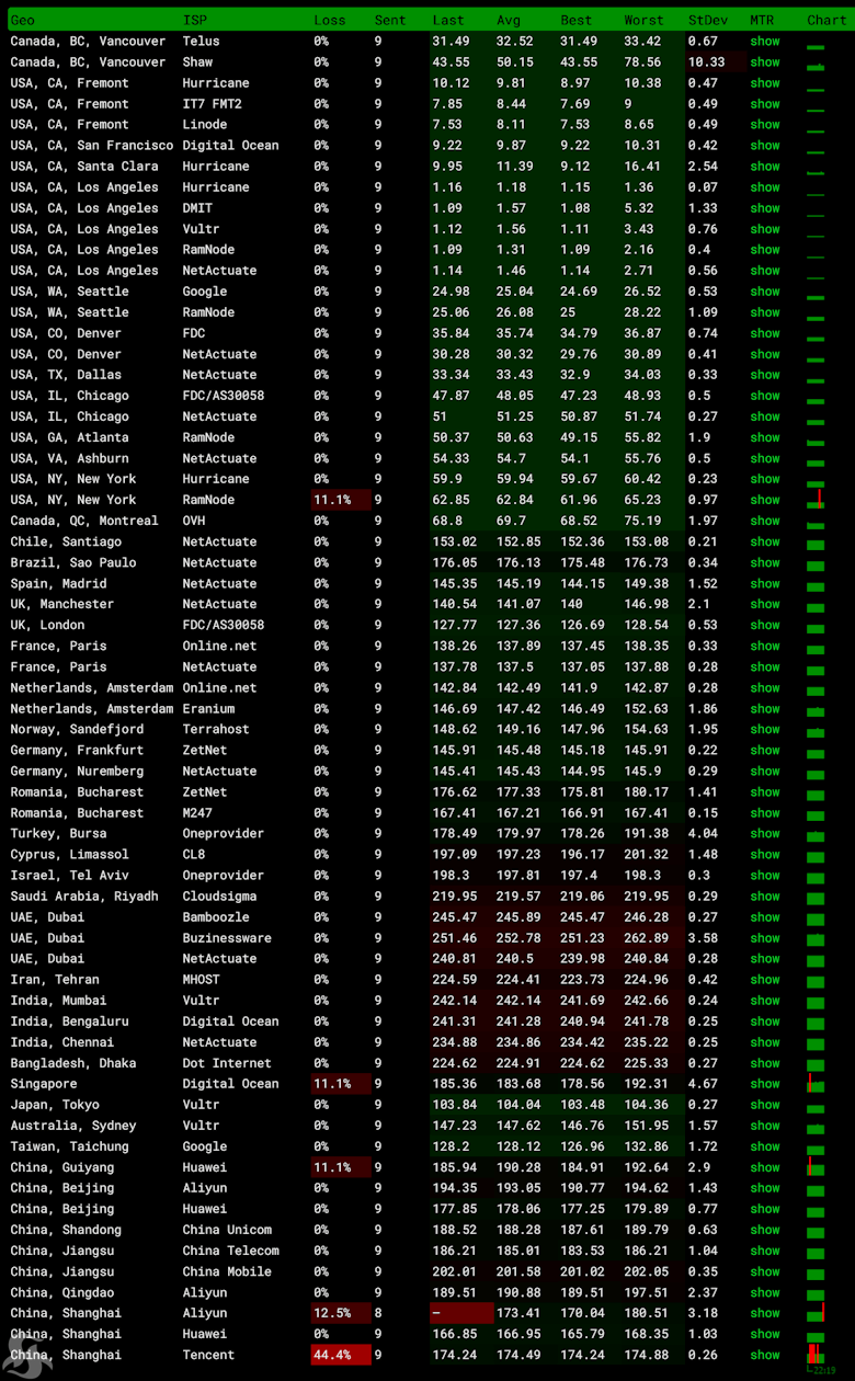 全球节点的测速可以看到,欧美地区的流畅度还是不错的,基本没有对包,对于亚洲和我们大陆的还是有一些丢包。
