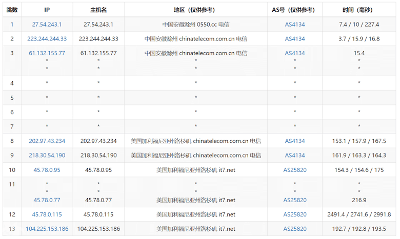 我们可以看到电信的去程,也并非CN2优化而是普通的线路直连。