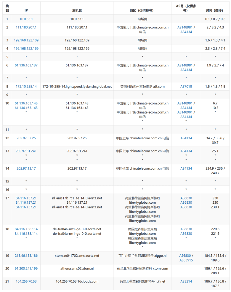 我们可以看到电信的去程还是稍微有一些绕的。