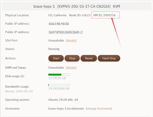 在这里打开当前搬瓦工VPS当前主机面板可以看到上面的 VM ID 标签。