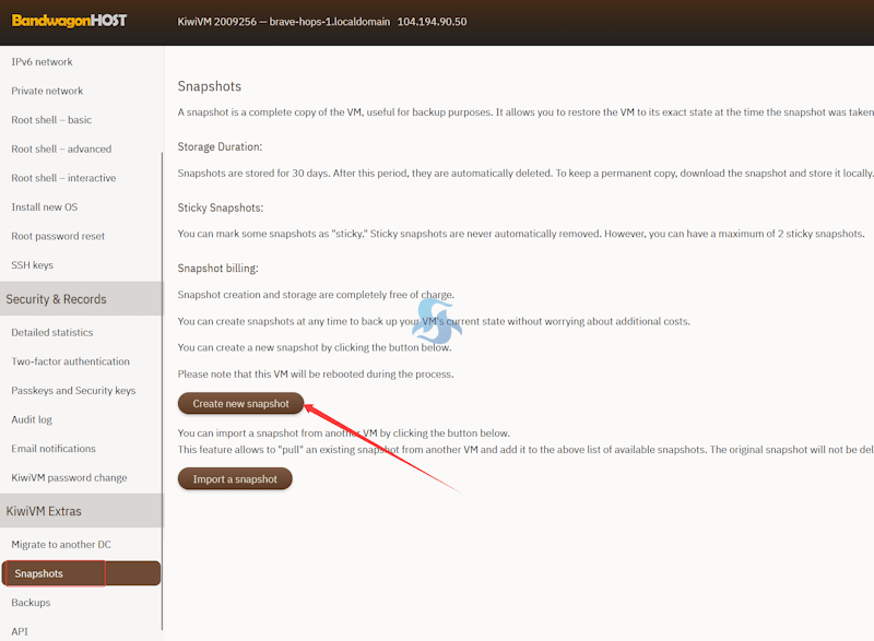 如图所示,看到搬瓦工VPS的Snapshots 菜单,在 Create New Snapshot 可以创建一个新的快照。也可以 Import a Snapshot 导入快照。
