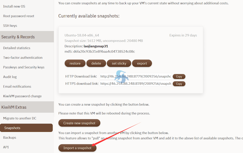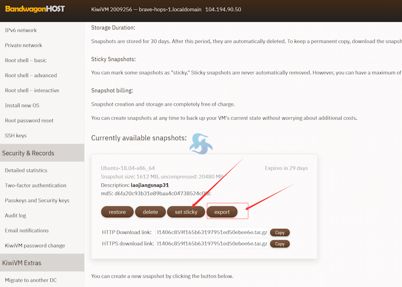 restore 这个表示复原恢复系统、delete 删除快照、set sticky 固定设置永久保存,最多可以设置2个。exprot 查看快照ID,用于API的快照迁移复原恢复数据。或者我们可以看到有提供下载快照到本地的地址。