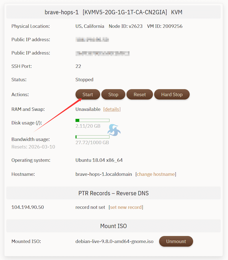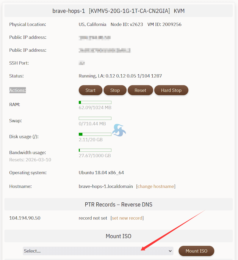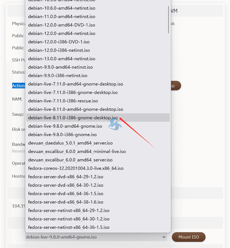 开通VPS主机之后,可以在当前主机的版本中找到如图所示的Mount ISO自定义选择镜像。