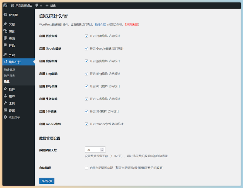 我们在运营网站的时候,是不是会关注到搜索引擎蜘蛛对于网站的抓取情况,这样可以检查到我们的网站内容是否受欢迎。如果搜索引擎蜘蛛抓取频率较低,或者较多,甚至有可能是伪蜘蛛的抓取,我们需要做相应的运维手段。在这里,我们可能会通过一些第三方工具或者是插件来实现这个问题。在这里,我们看到有这样的需求情况,老蒋也根据自己的需求设计到这款 LeSpiderAnalysis 蜘蛛爬行的监控记录插件。