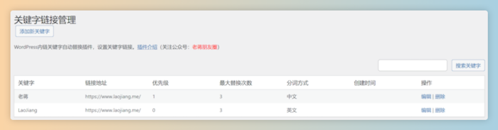 我们可以激活插件后提前添加关键字以及设置的URL,包括可以设置优先级和最大替换次数。当然同时支持中文和英文分词技术的。我们在添加后,可以对关键字进行管理。