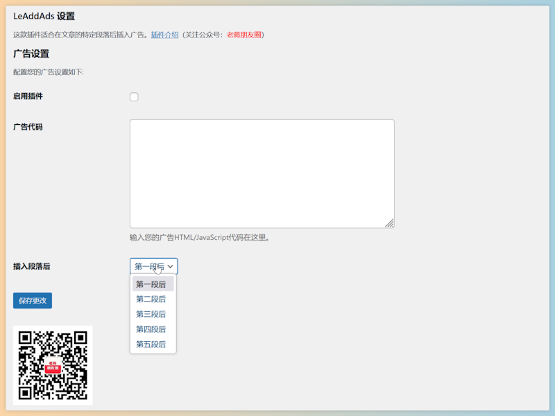 我们可以启动插件,然后将插入的广告和代码,支持JS和HTML 代码,然后对于插入段落可以自己选择。