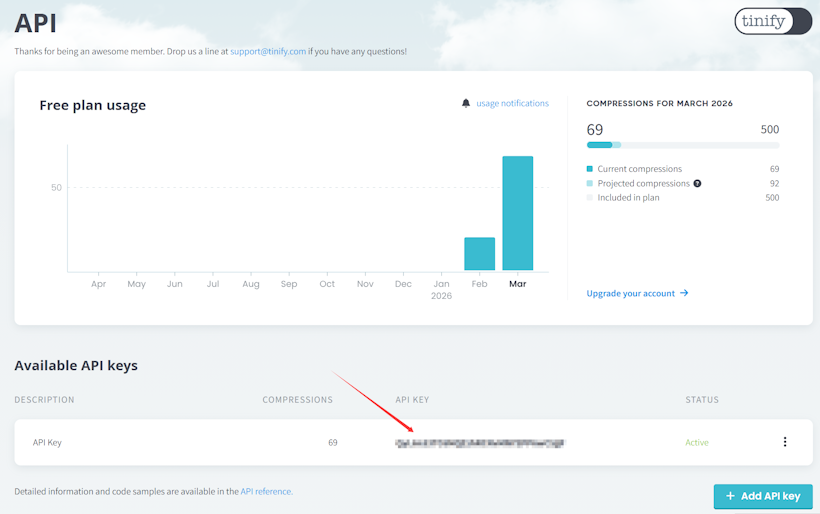 免费用户每月500张图压缩资格,在后台可以看到创建的密钥KEY,以及当前月已经使用到的额度。如果超过额度的,那就不会压缩。所以,如果我们是手动更新网站的,且有配图不多的,这个有需要自动压缩图片体积的插件还是可以用到的。
