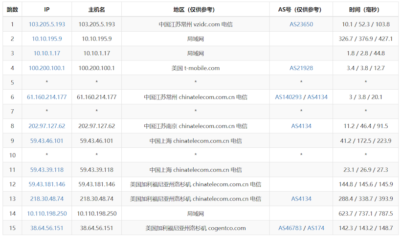 电信去程从中国电信常州节点(AS23650)出发,经T – Mobile(AS21928)中转后,接入中国电信南京、上海骨干网(AS4134),最终通过Cogentco(AS174)抵达洛杉矶电信机房;国内段路由衔接顺畅、延迟低,国际段上海至洛杉矶跨洋延迟约144.8ms,整体为“电信骨干网 + 国际伙伴”混合架构,保障国内接入质量与国际链路可达性。