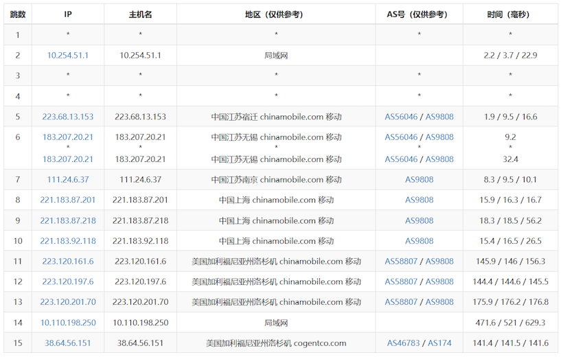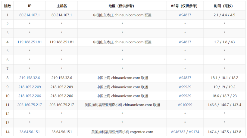 对于联通去程,我们可以看到联通去程从山东枣庄(AS4837)出发,经上海联通(AS4837/AS9929)节点后,由洛杉矶Cogentco(AS174)直达机房;国内段路由简洁、延迟低(枣庄→上海仅19ms级),国际段上海至洛杉矶跨洋延迟约146ms,整体路径依托联通骨干网与Cogentco直连,实现国内低延迟与国际链路的高效衔接。
