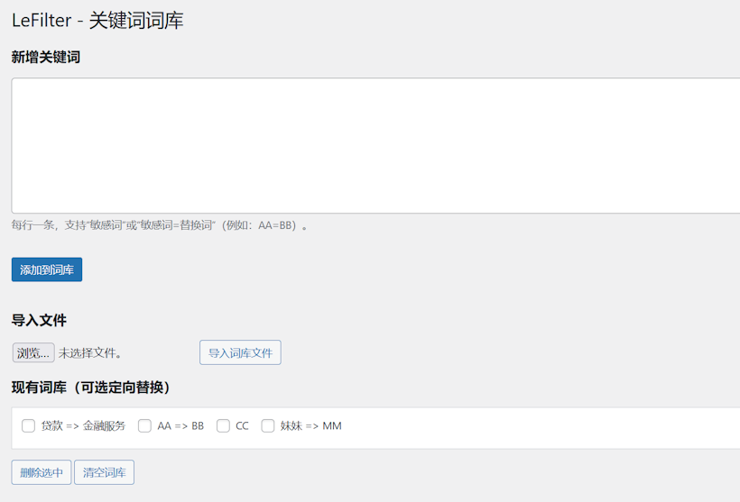 根据需要自定义导入关键字。也可以根据需要指定替换关键字,如果你不指定,就会以前面基础设置的指定过滤动作。也可以根据现有的词库删除,这里我们也有采用防止重复的机制,如果你有添加过,会过滤掉不会重复添加。